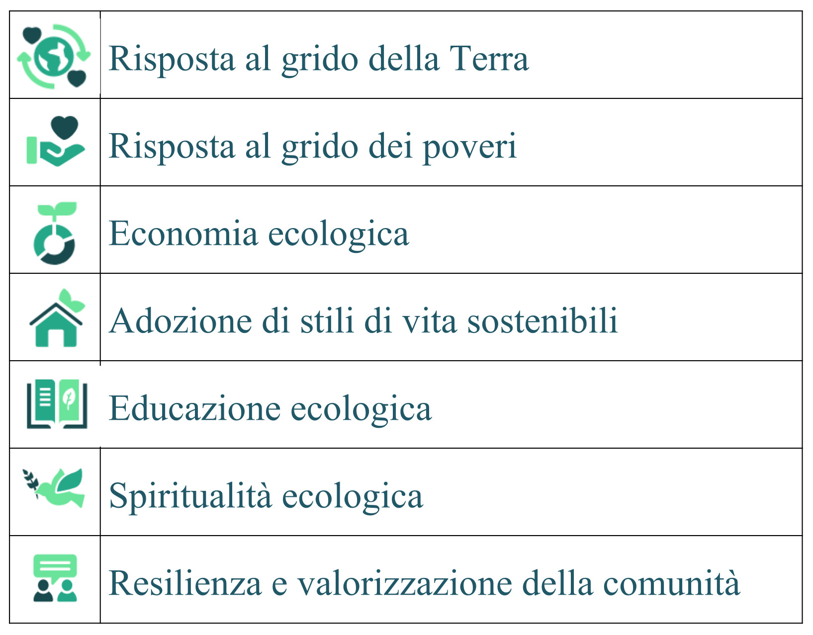 Infine, sul lato destro, troviamo l’educazione ecologica e la spiritualità ecologica, che sono gli obiettivi che portano alla conversione ecologica e alla rivoluzione culturale di cui abbiamo bisogno per un futuro sostenibile, equo e fraterno.